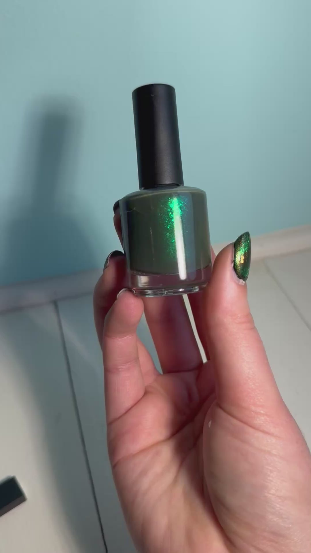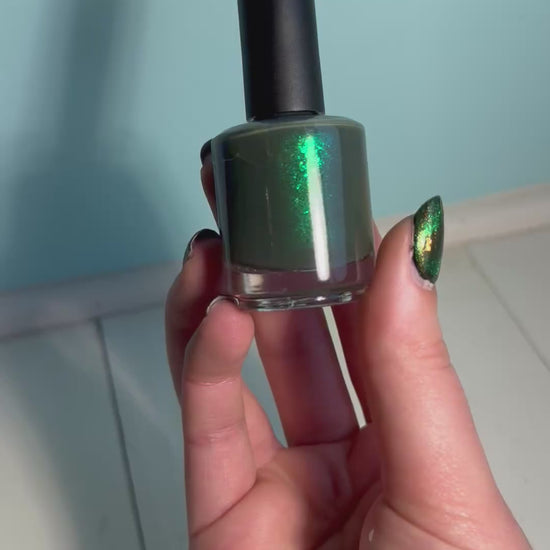 A hunter green polish with glowy emerald microflake shimmer