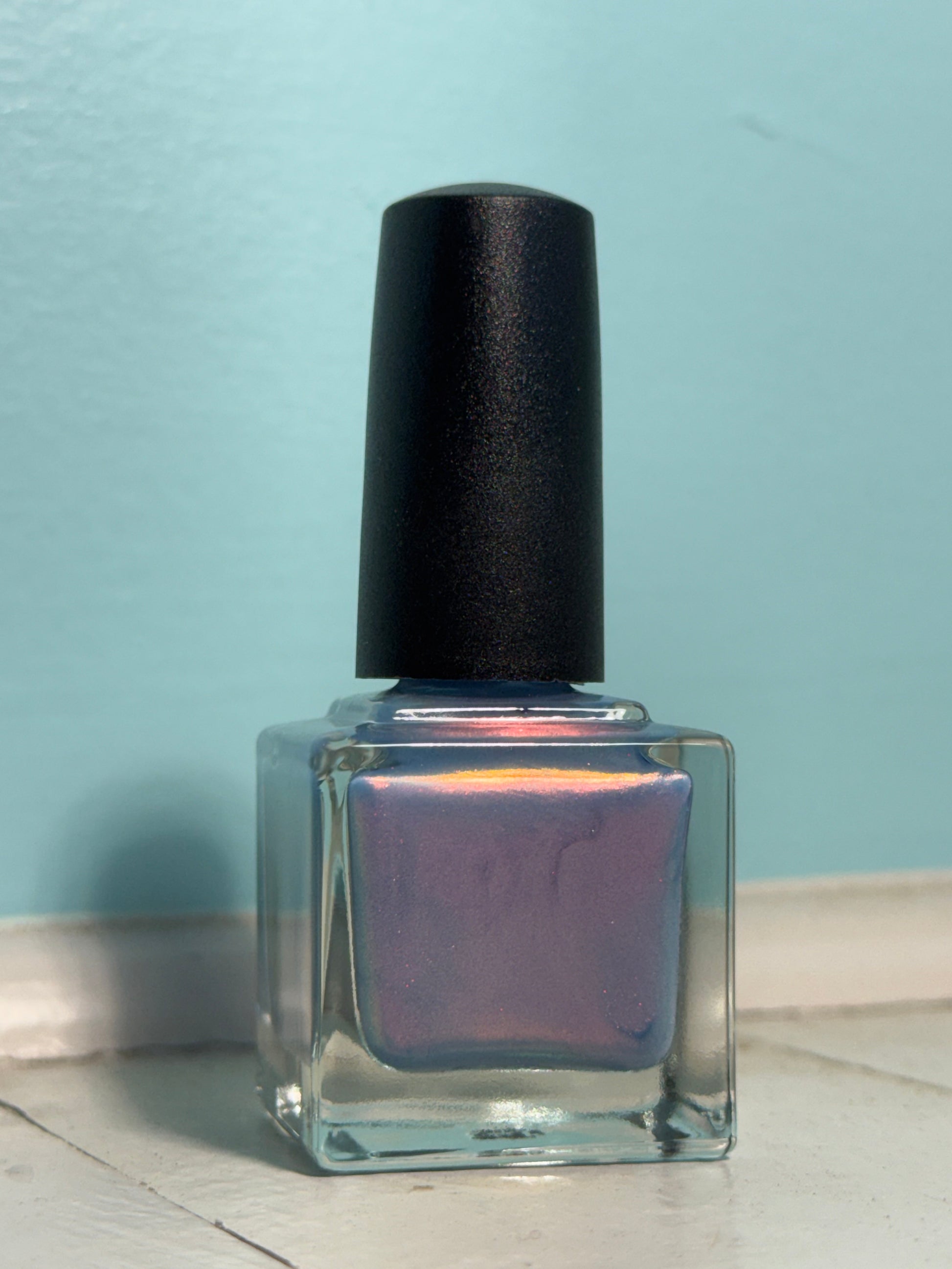A pastel denim blue with a hazy pink to orange shimmer