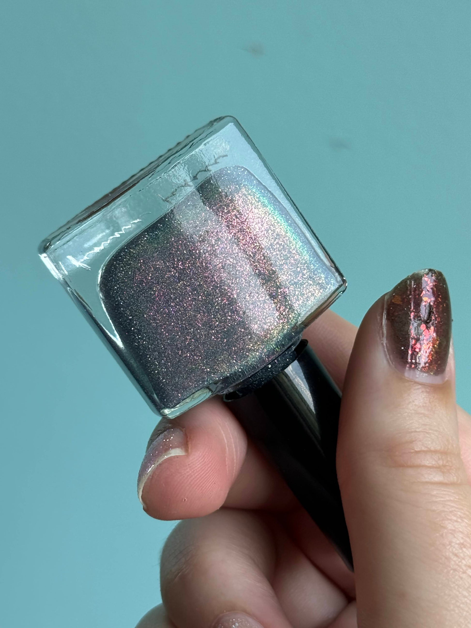 Jan 2024 HHC. A soft, dove-blue base with large, glass-flake shimmer that shifts between pink-gold-green.