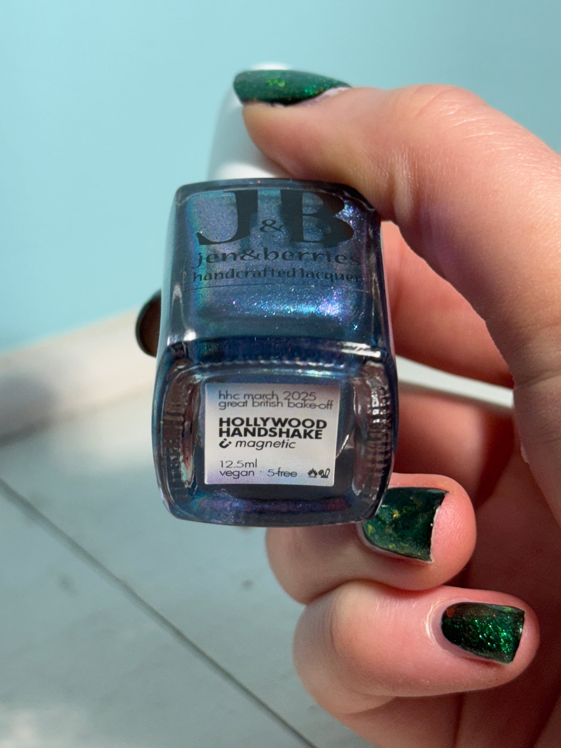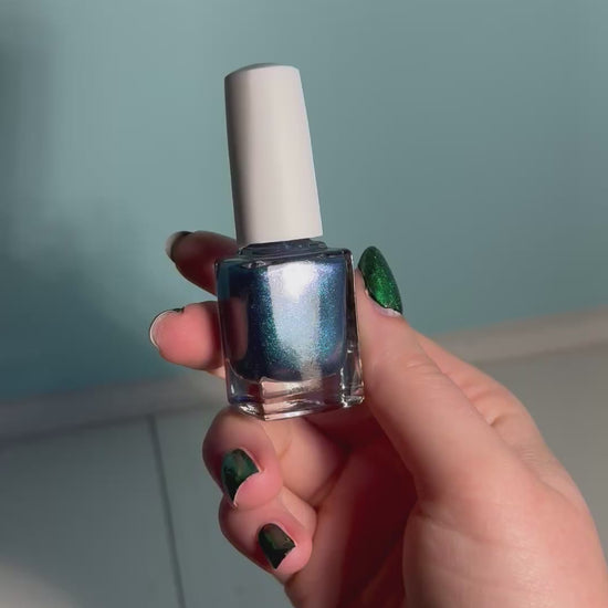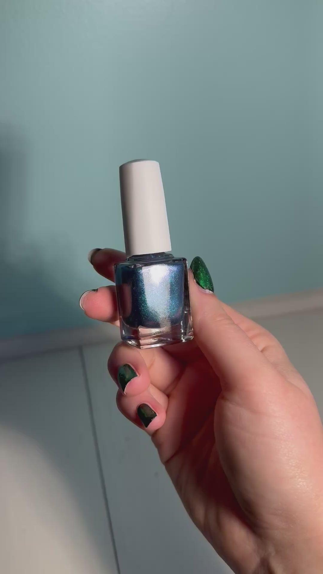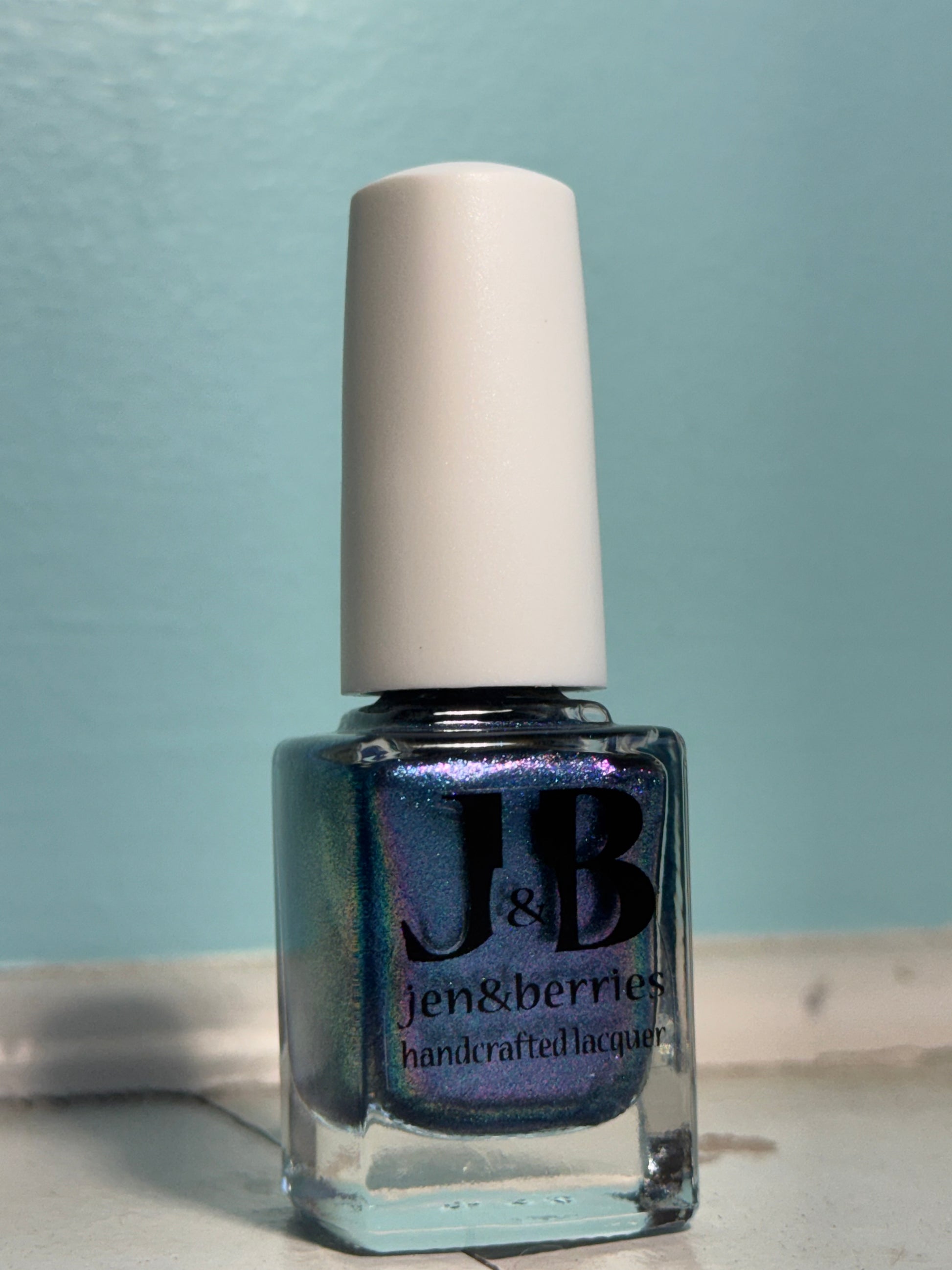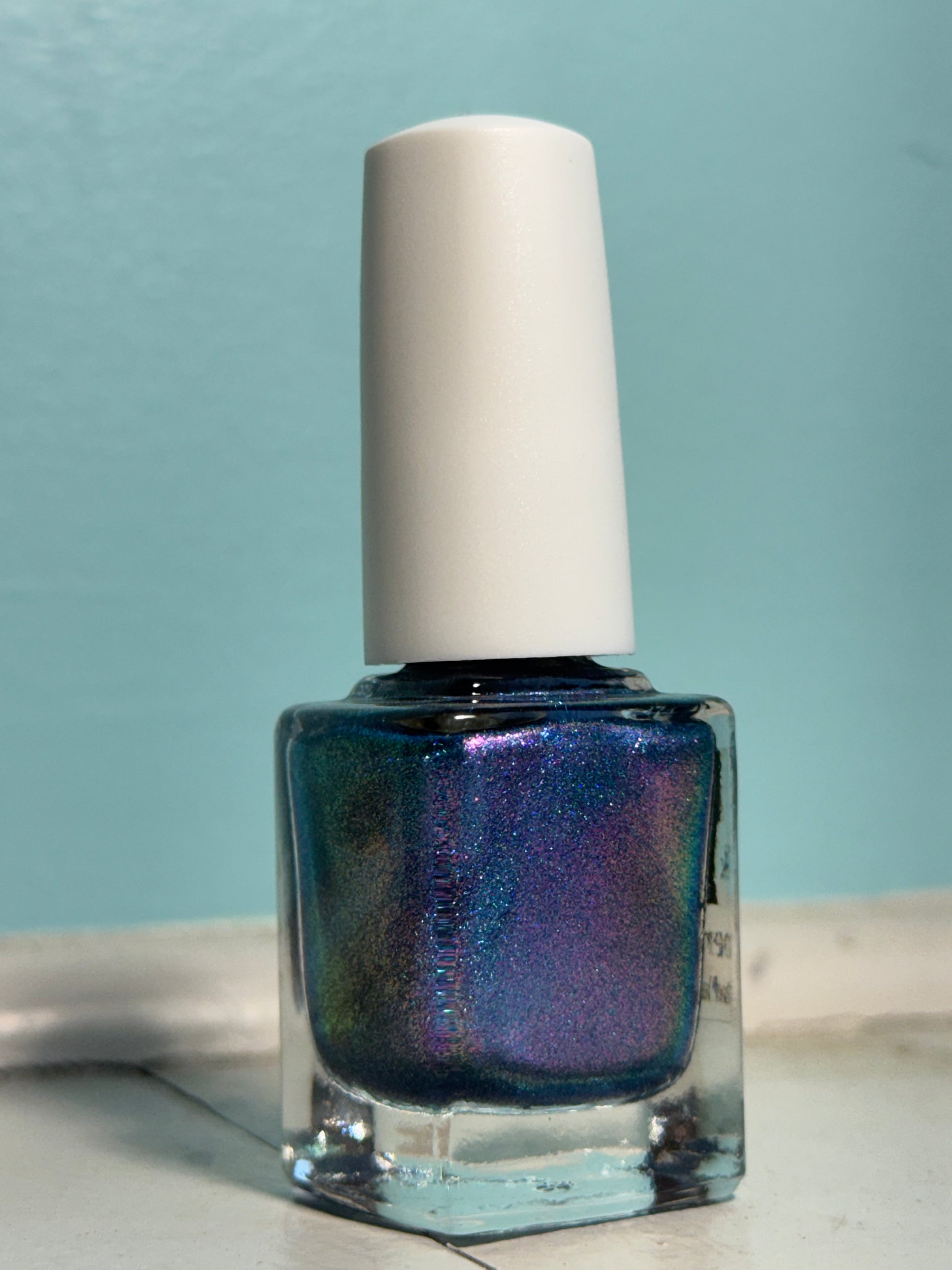A black tinted base with strong purple to pink shifting shimmer and a bright blue magnetic shimmer.