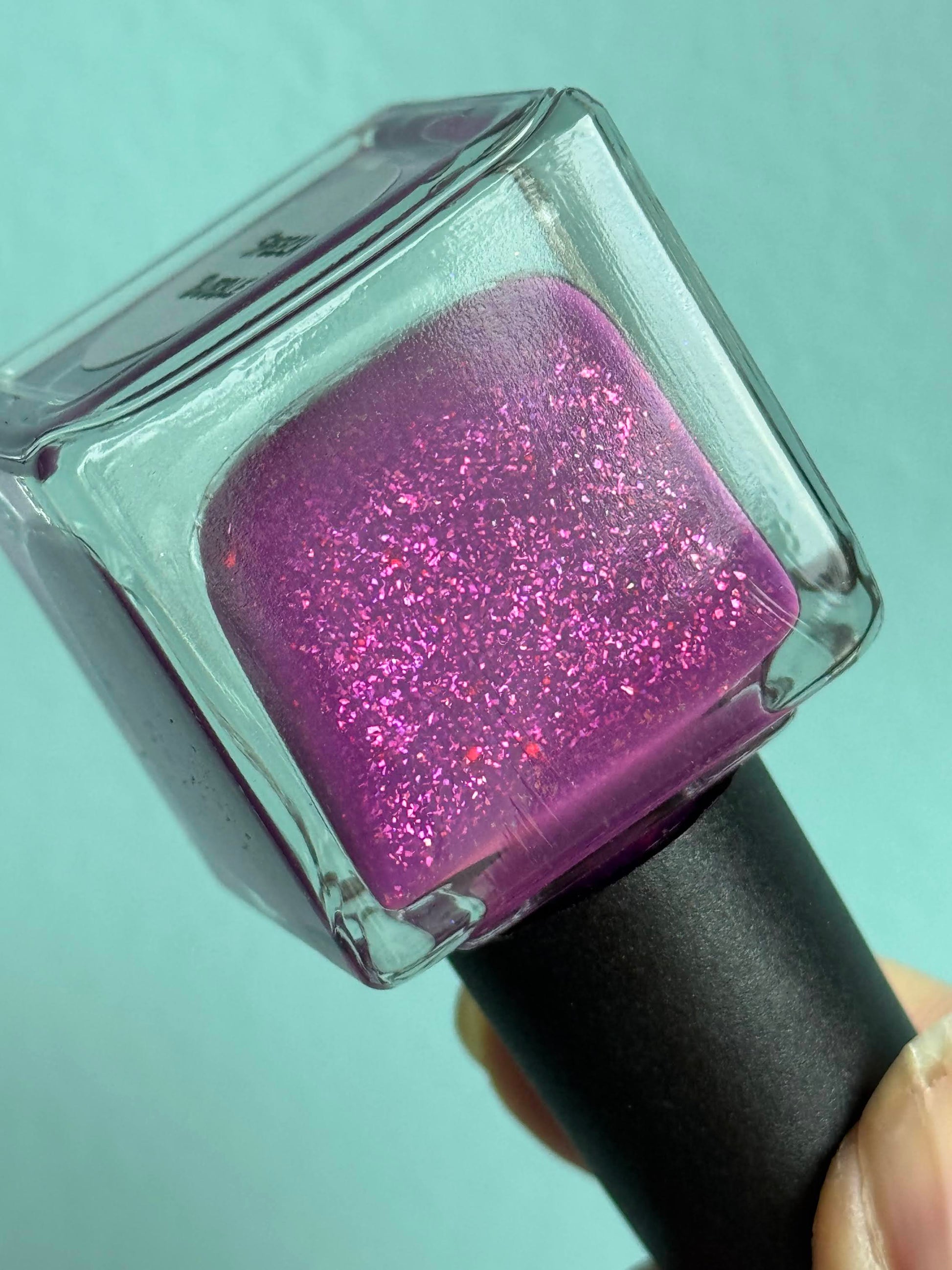 Speech Bubble is a vivid violet packed with large particle pink to red to violet shimmer that shifts gold at extreme angles.