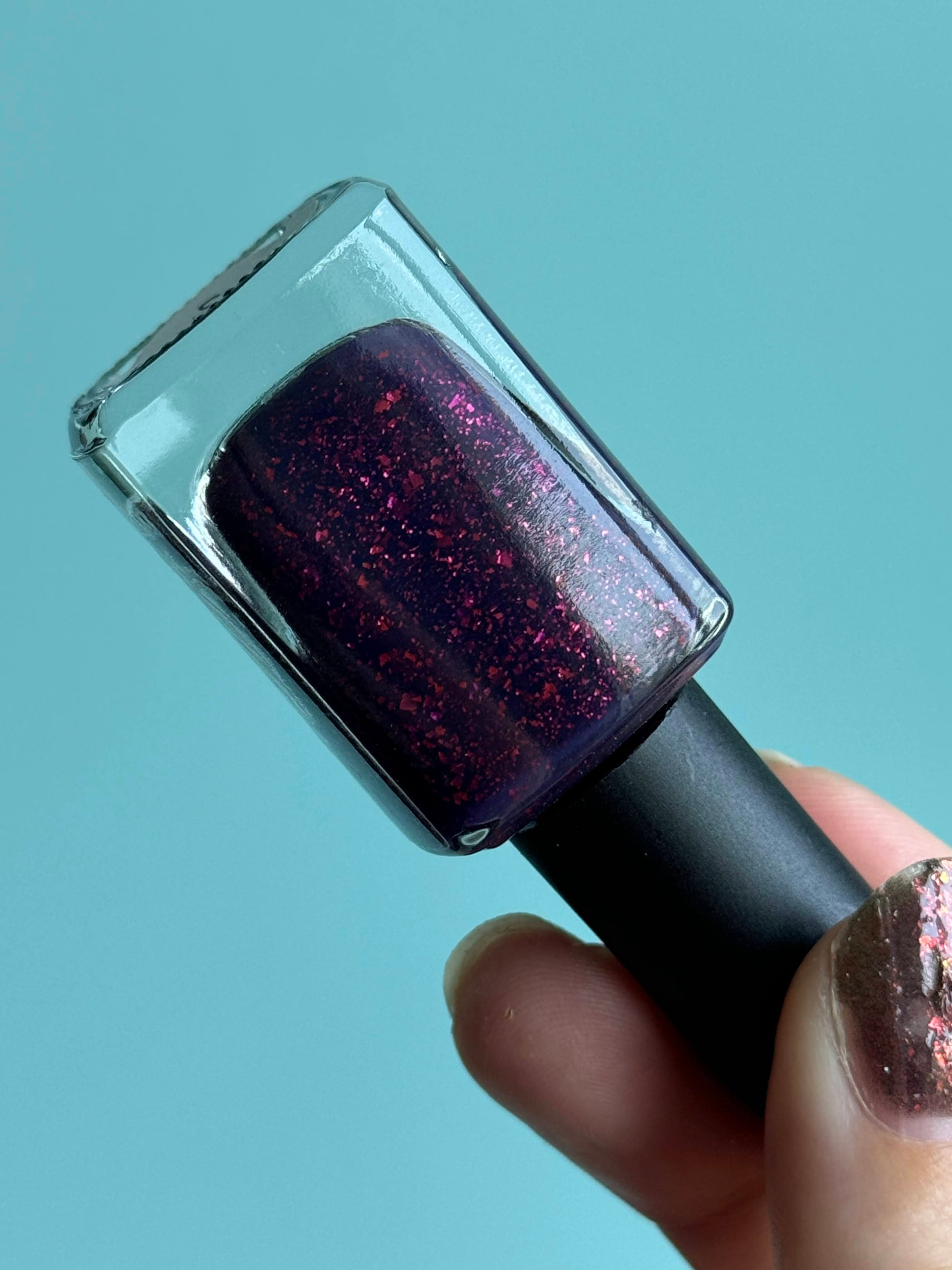 A squishy plum-purple crelly with red metallic flakes